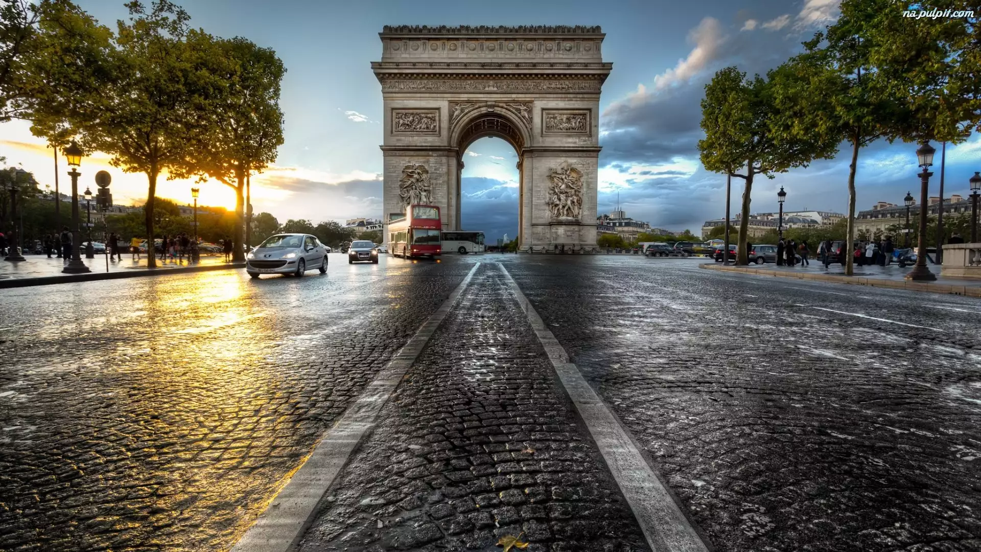 Autobusy, Łuk Triumfalny, Paryż, Francja, Drzewa, Ulica, Samochody