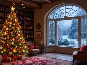 Zima, Salon, Okno, Fotele, Prezenty, Udekorowana, Choinka, B