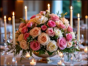 Świece, Grafika AI, Bukiet, Róże, Stół