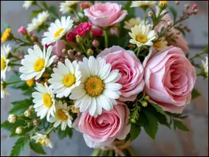 Bukiet, Kwiaty, Róże, Margerytki, Różowe, Białe