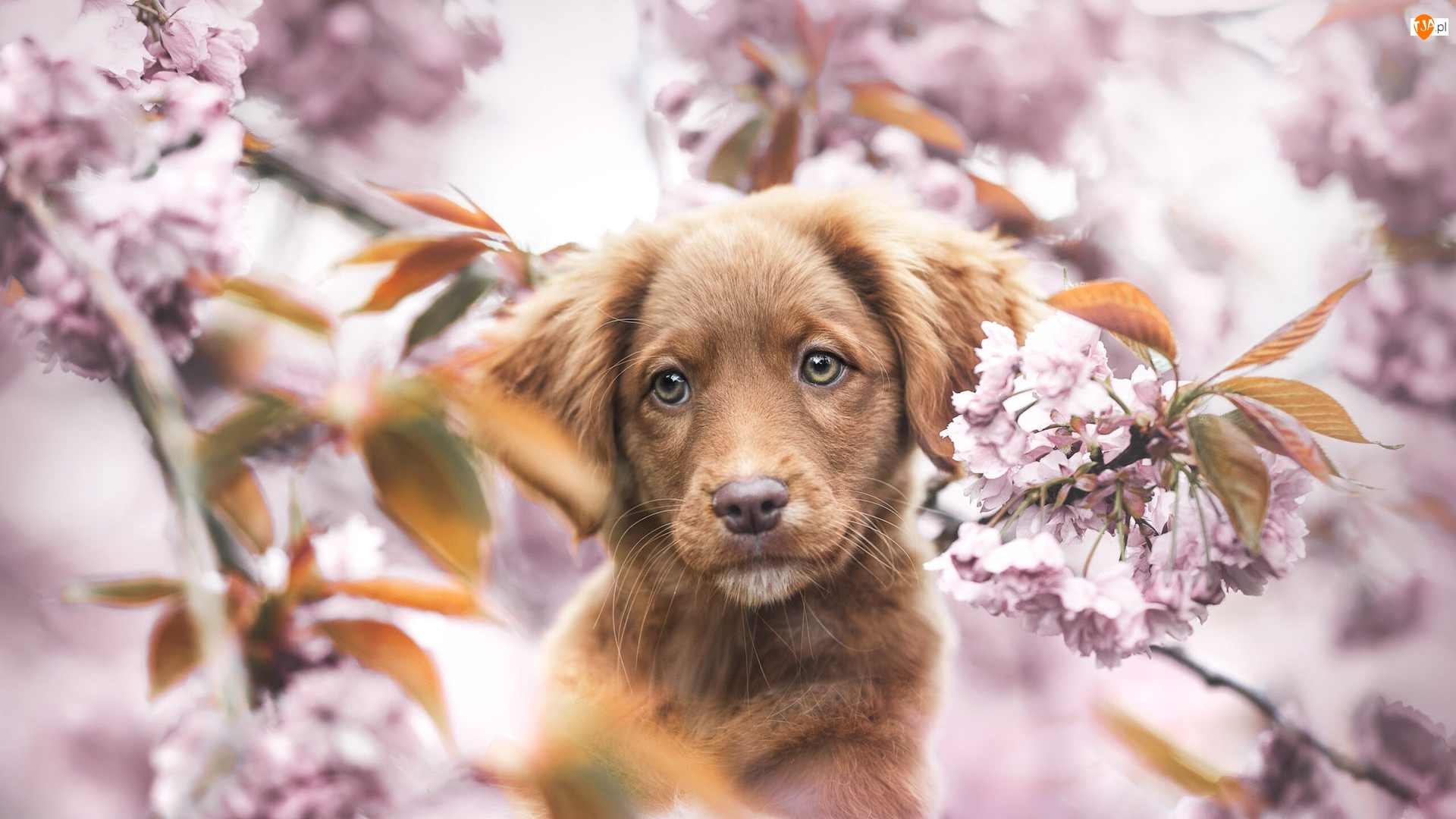 Brązowy, Szczeniak, Rozmycie, Pies, Drzewo owocowe, Kwiaty, Retriever z Nowej Szkocji