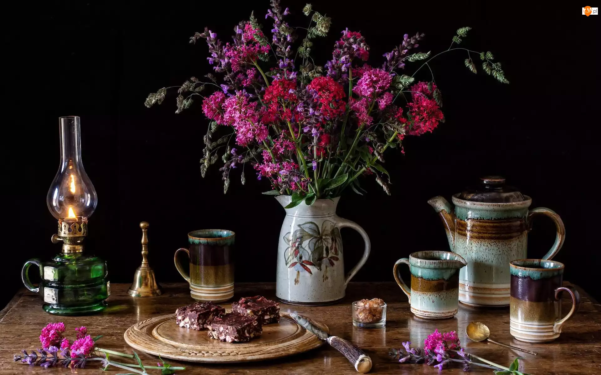 Bukiet kwiatów, Kompozycja, Dzbanek, Ciasto, Lampa, Kubki