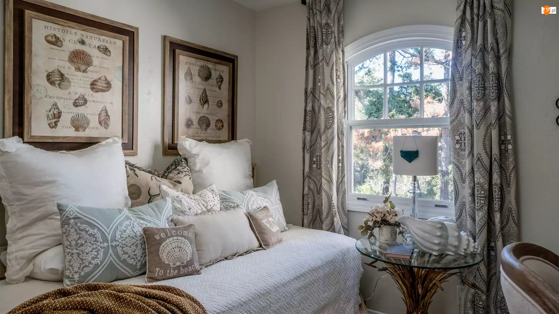 Bukiet, Łóżko, Sypialnia, Kwiaty, Okno, Stolik, Obrazy, Poduszki