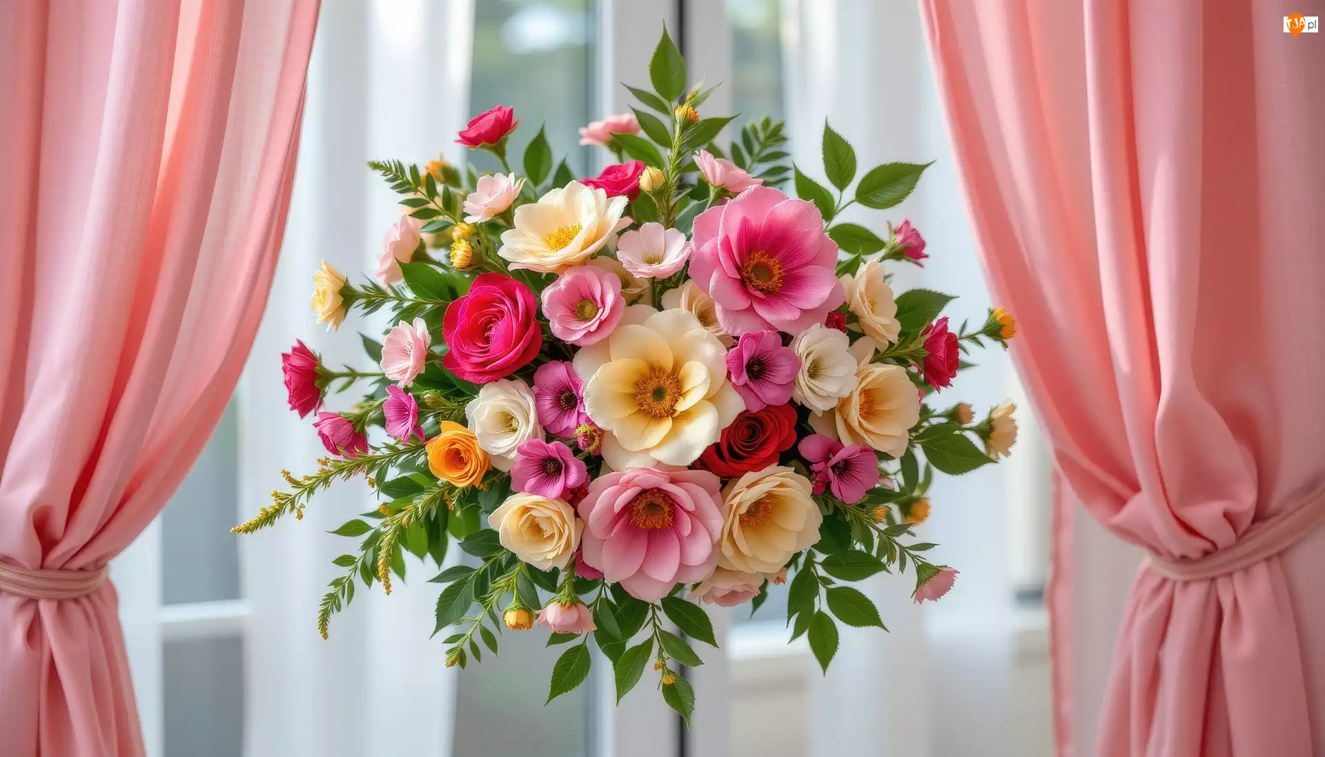 Bukiet, Wiszący, Okno, Grafika AI, Kwiaty, Zasło