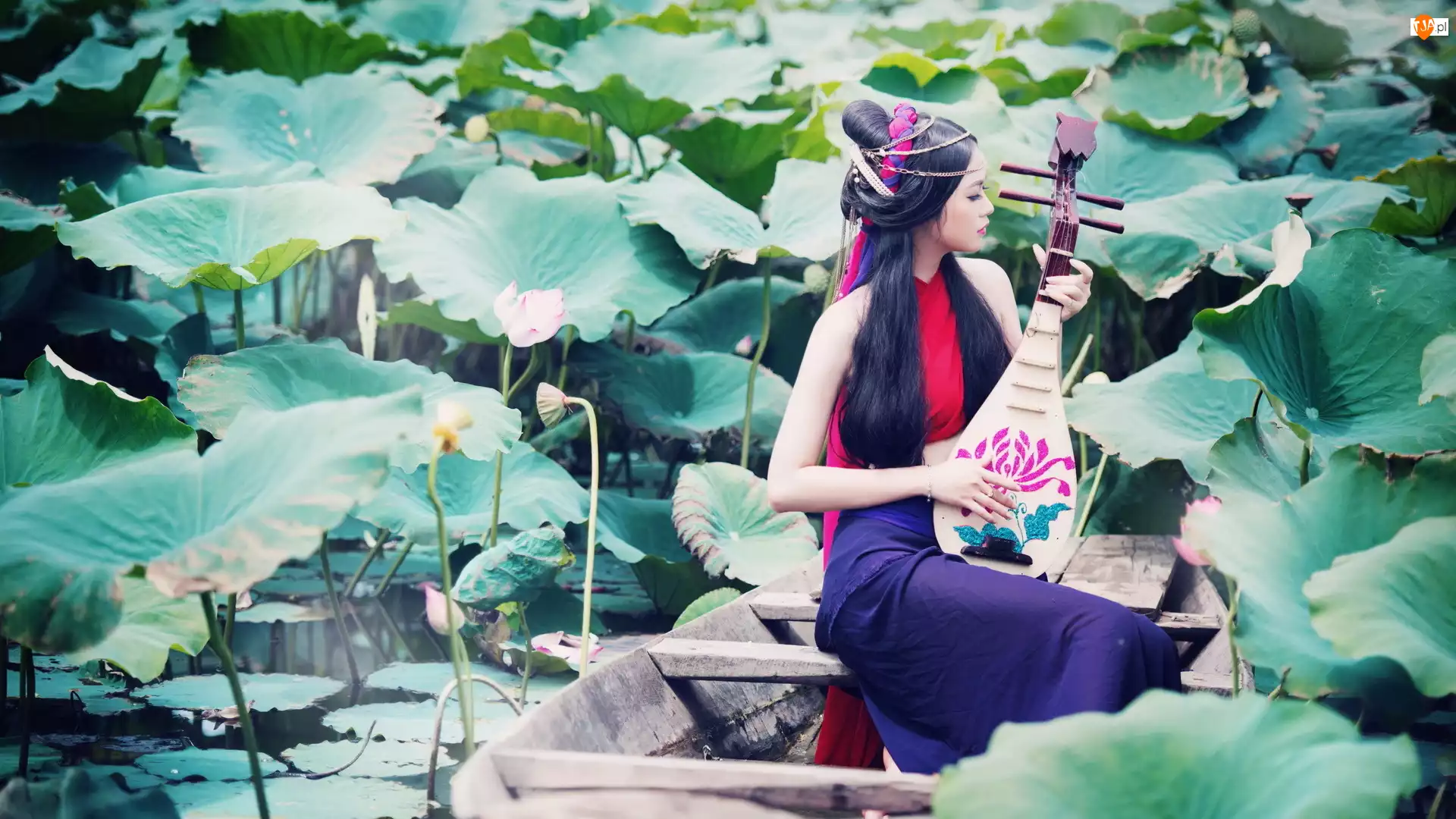 Chińska, Azjatka, Liście, Lutnia, Kobieta, Łódka, Pipa, Woda