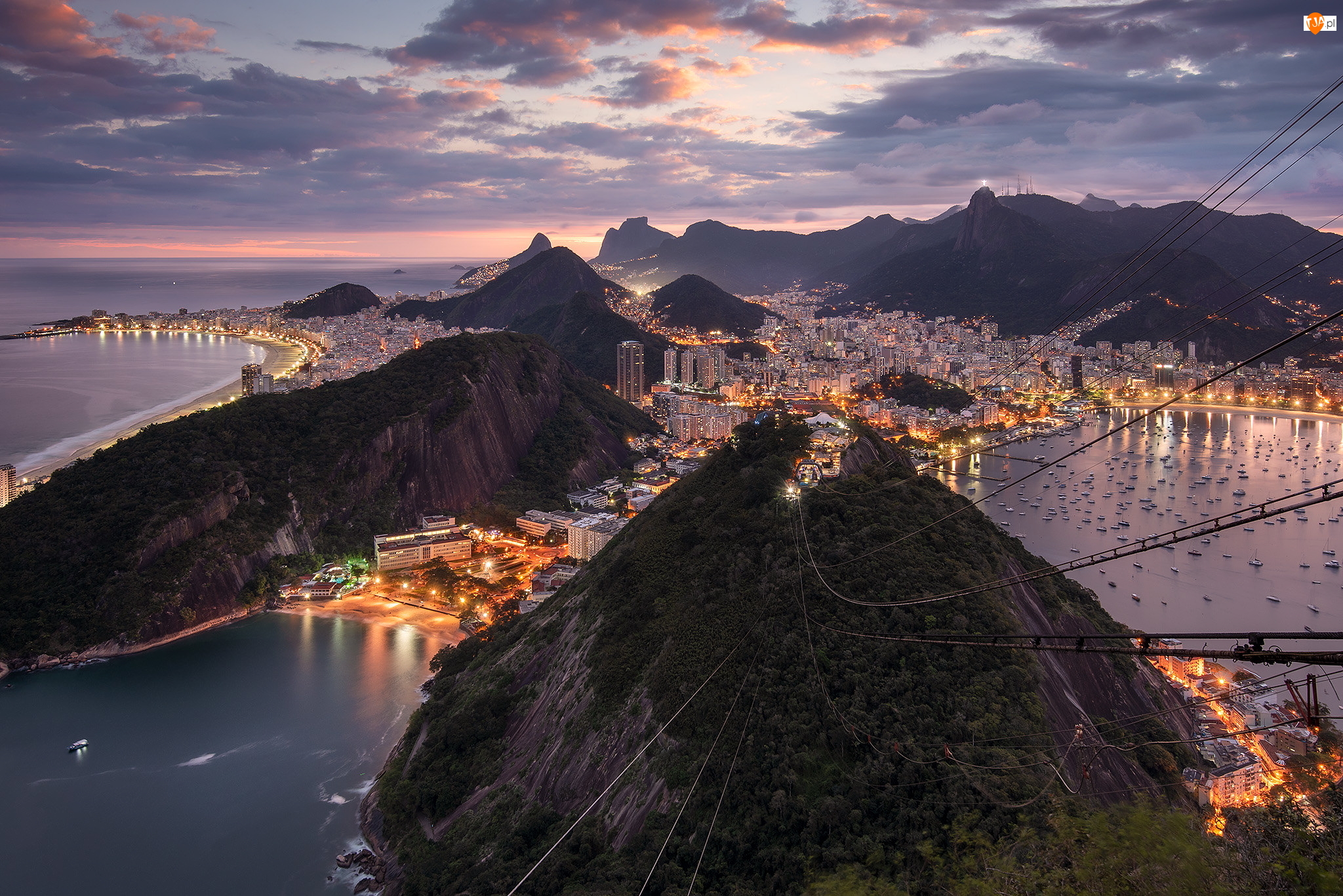 Chmury, Domy, Światła, Góry, Rio de Janeiro, Brazylia, Zatoka Guanabara, Morze, Statki, Zachód słońca