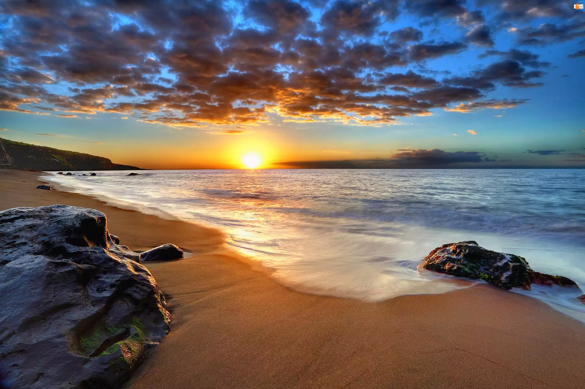 Chmury, Morze, Lato, Plaża, Zachód Słońca
