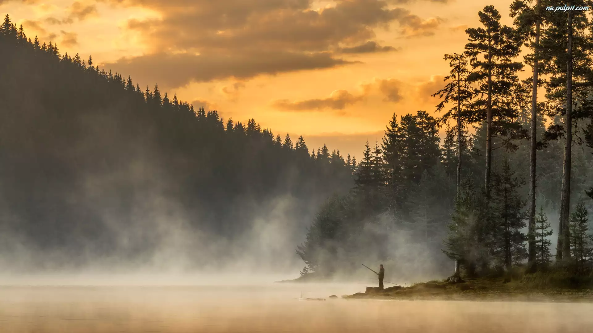 Rzeka, Las, Mgła, Wędkarz, Drzewa, Człowiek