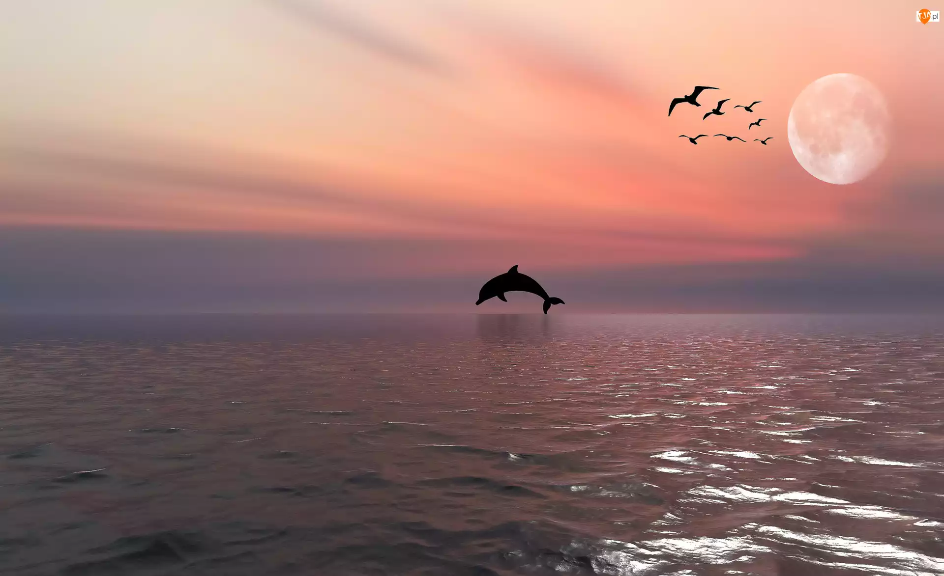 Ptaki, 2D, Delfin, Morze, Księżyc