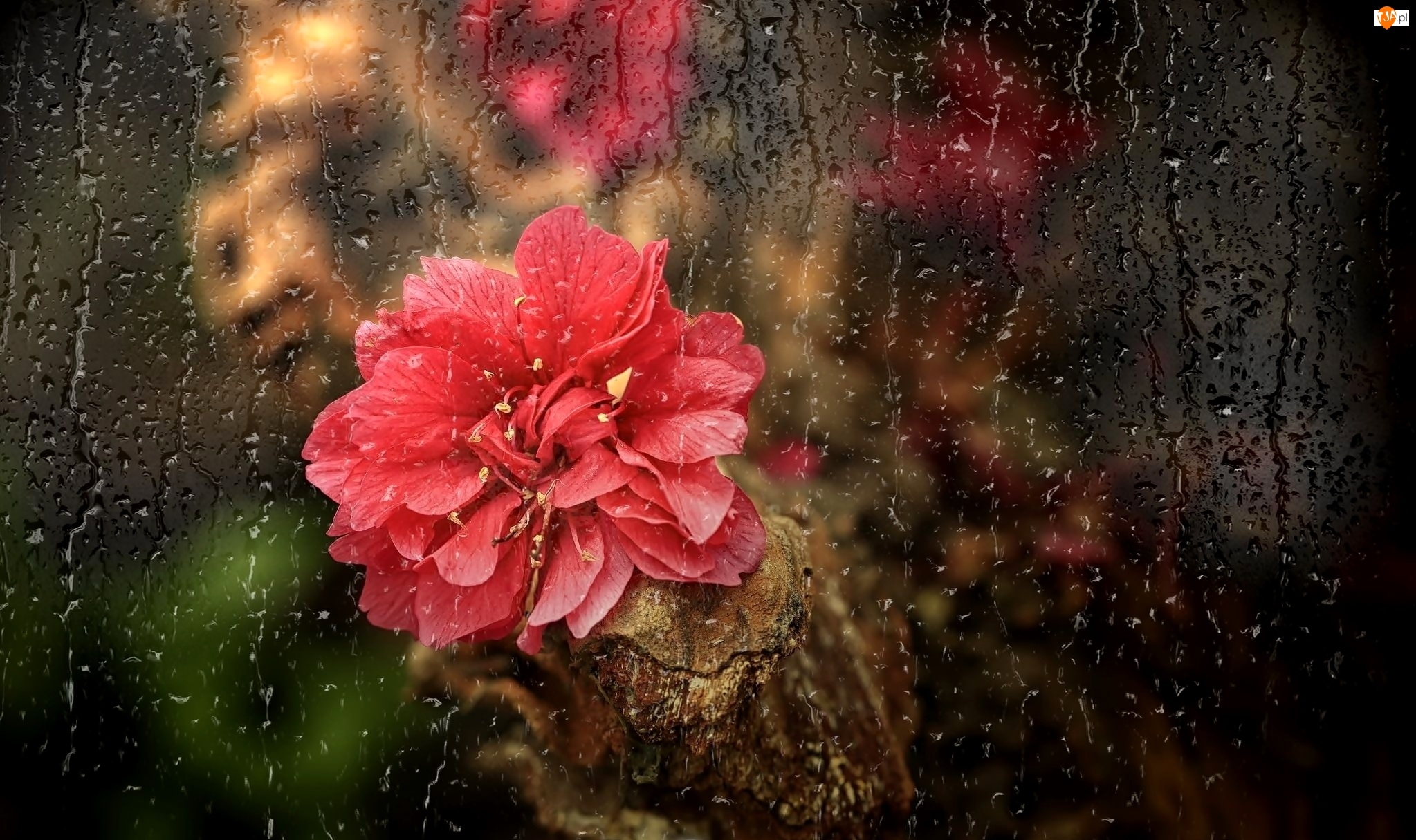 Deszczu , Spływające , Kwiat, Czerwony, Odbicie, Szyba, Krople