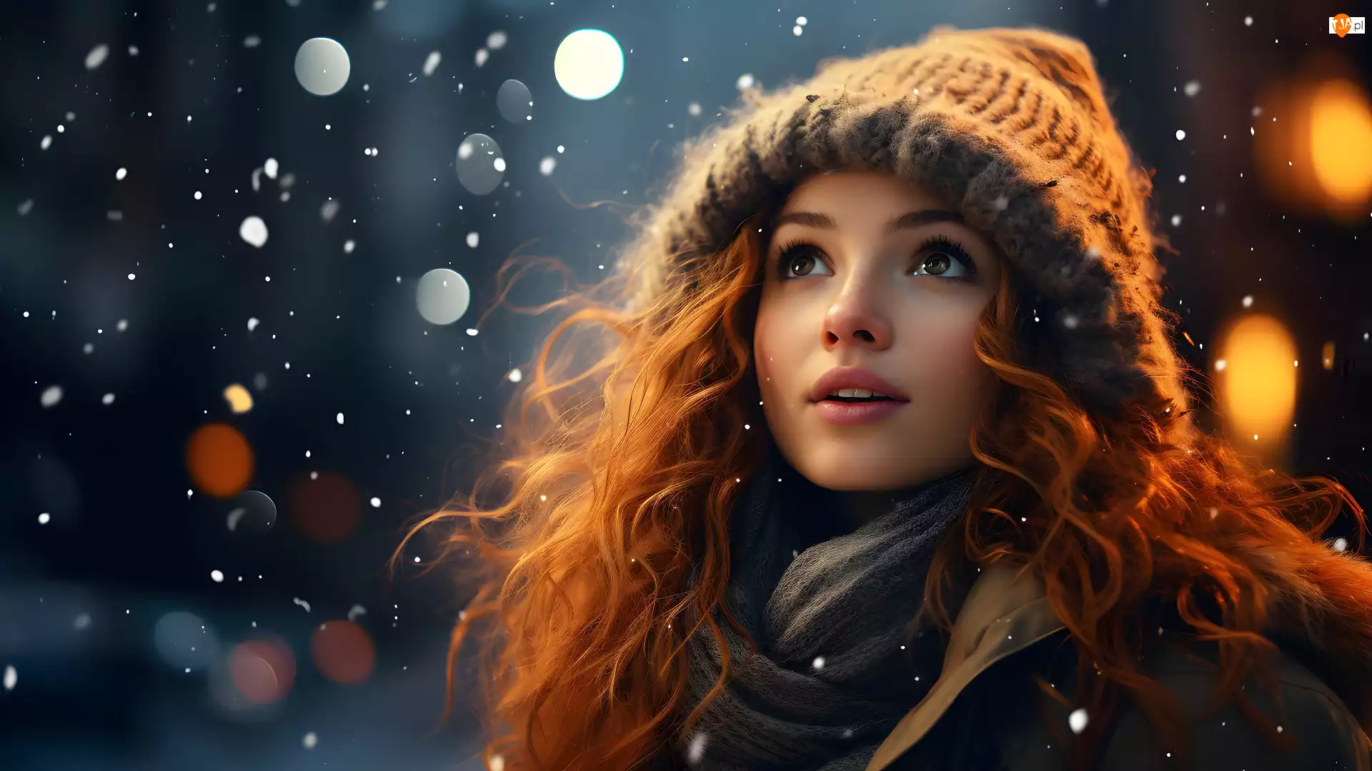 Długowłosa, Spojrzenie, Grafika, Dziewczyna, Kurtka, Szalik, Czapka