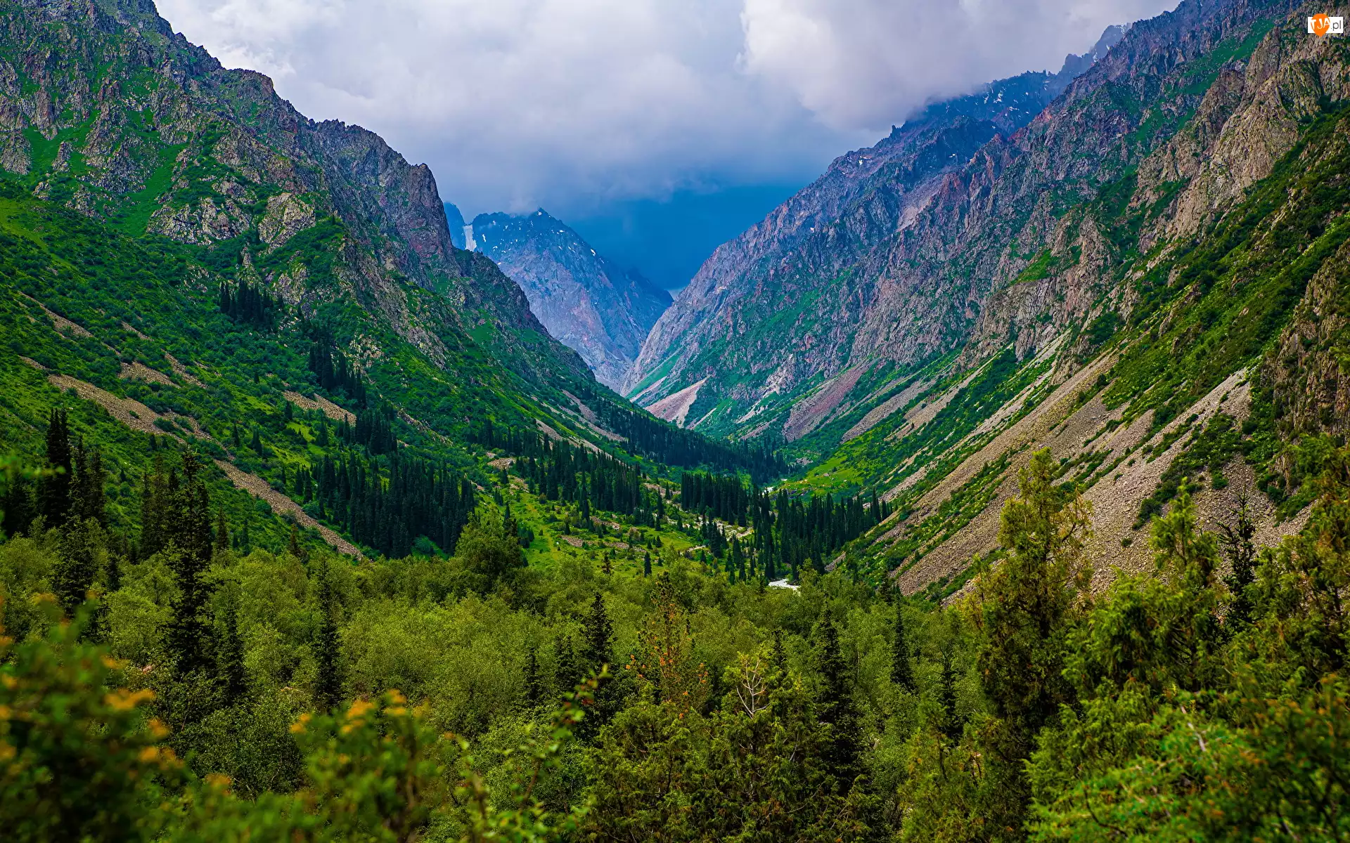 Dolina, Góry, Lasy, Chmury, Zielone, Drzewa
