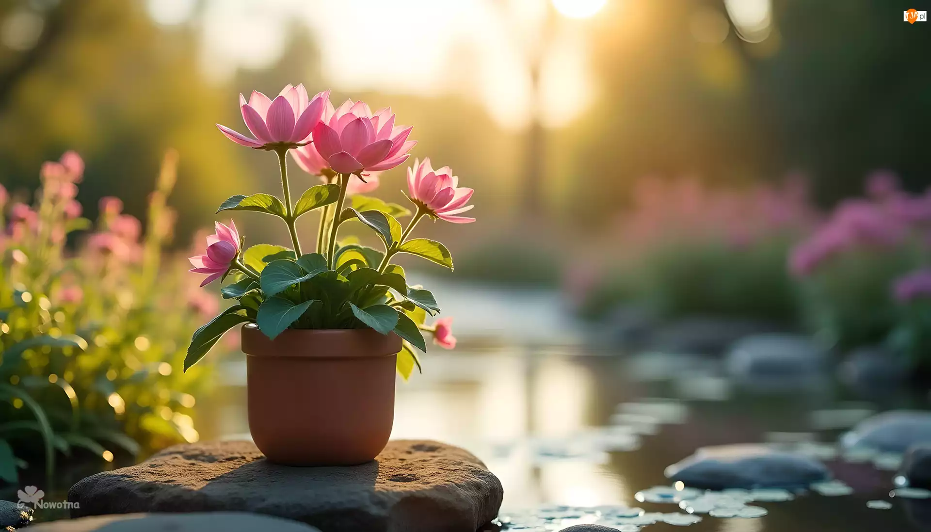 Doniczka, Grafika, Kwiaty, Różowe, Staw