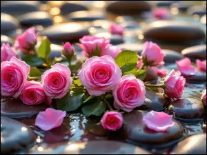 Różowe, Róże, Kamienie, Grafika AI, Kwiaty, Woda