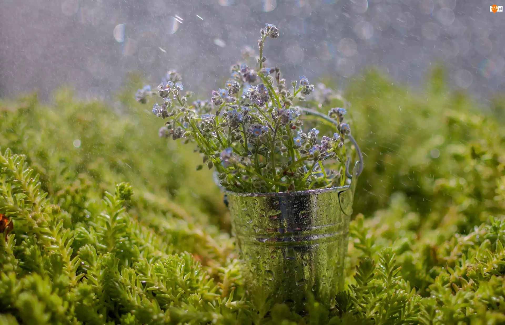 Drobne kwiatki w wiaderku na roślinach podczas de