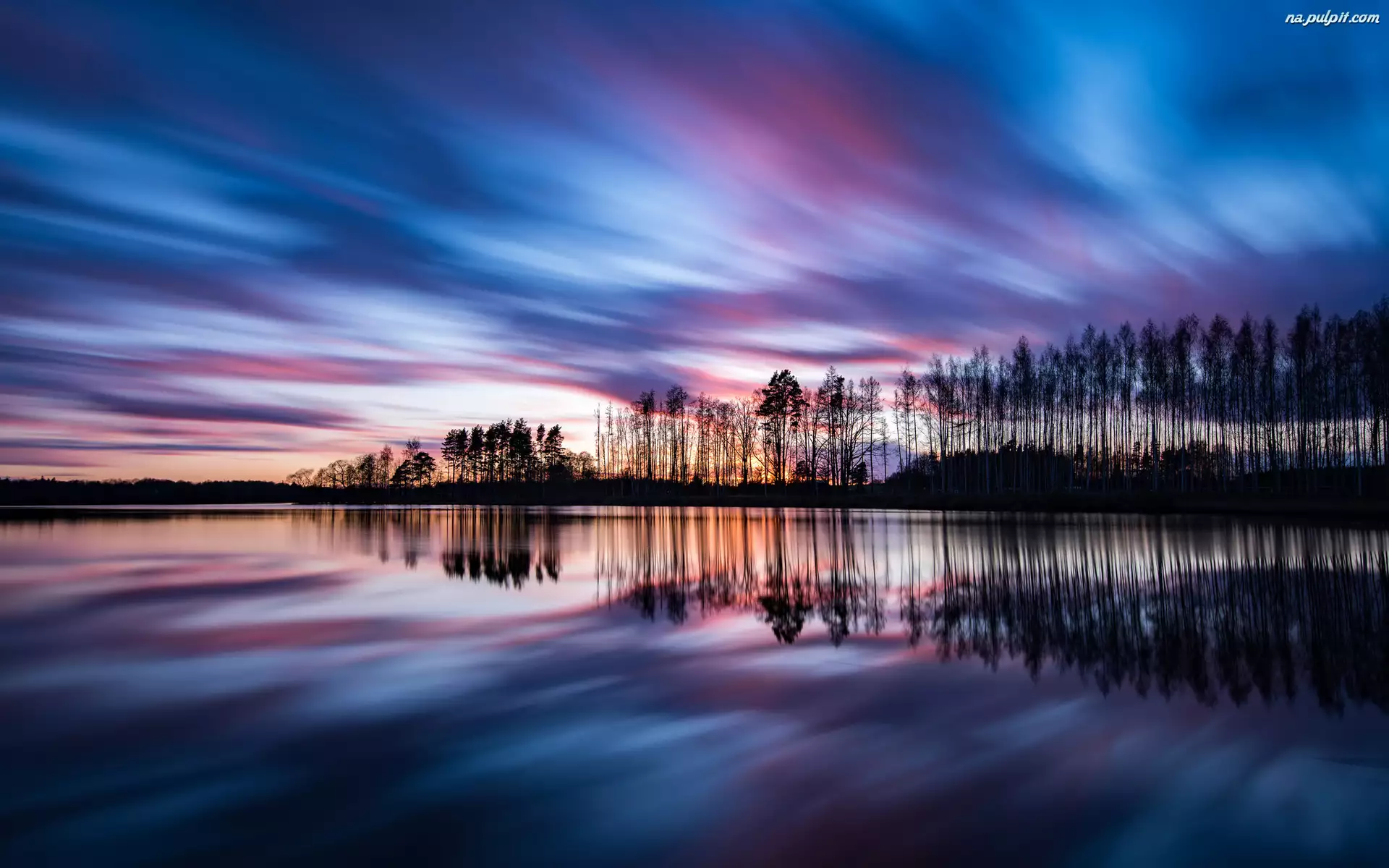 Drzewa i niebo w lustrzanym odbiciu jeziora o zach
