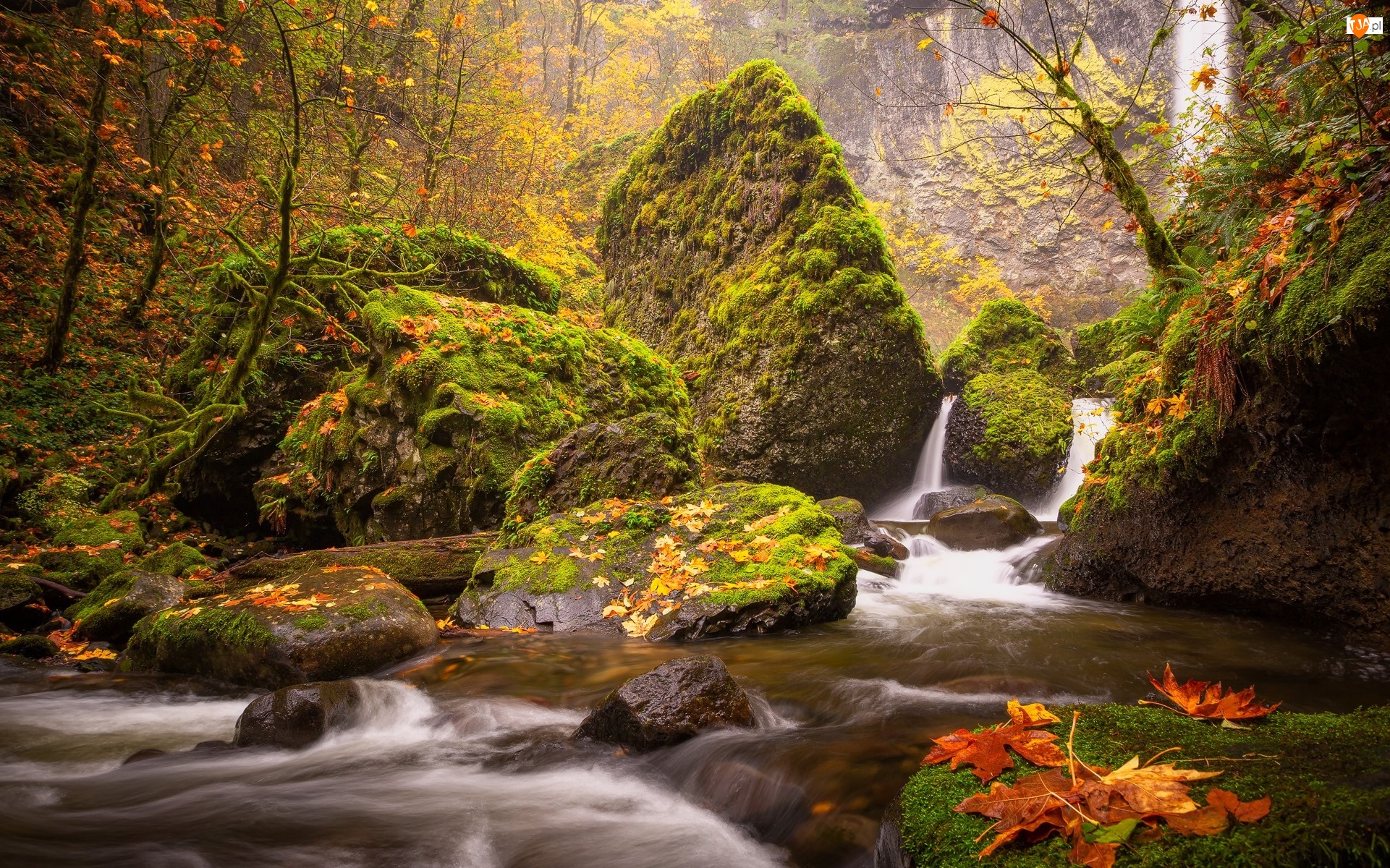 Drzewa, Jesień, Skały, Rzeka, Liście