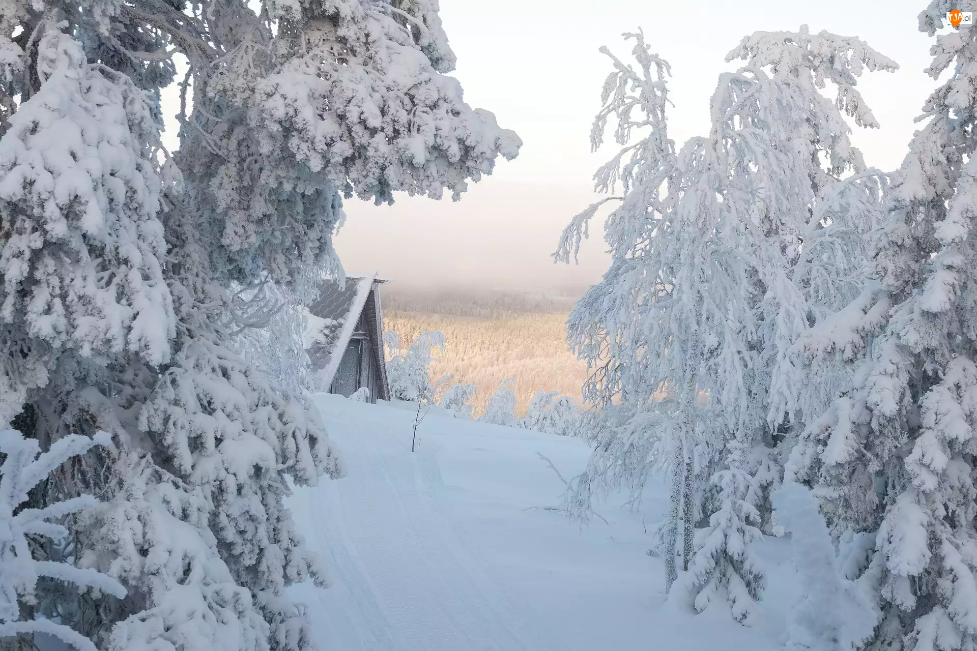 Drzewa obok domu na wzgórzu zasypane śniegiem