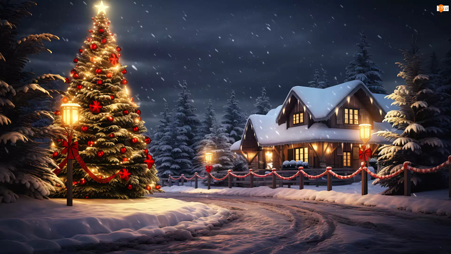 Drzewa, Śnieg, Ośnieżone, Boże Narodzenie, Świerki, Zima, Udekorowana, Dom, Ulica, Choinka, Latarnie, Noc