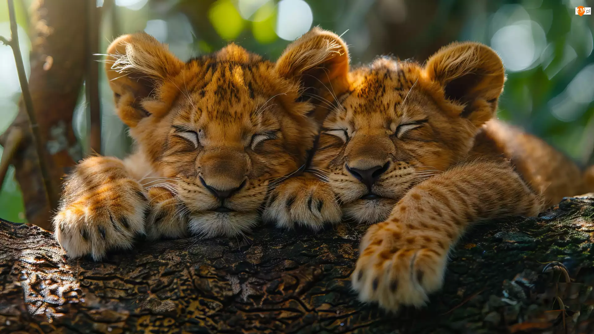 Dwa, Śpiące, Drzewa, Lwy, Konar, Sen, Lwiątka