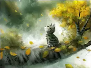 Kot, Mały, Drzewo, Grafika AI, Szary, Liście