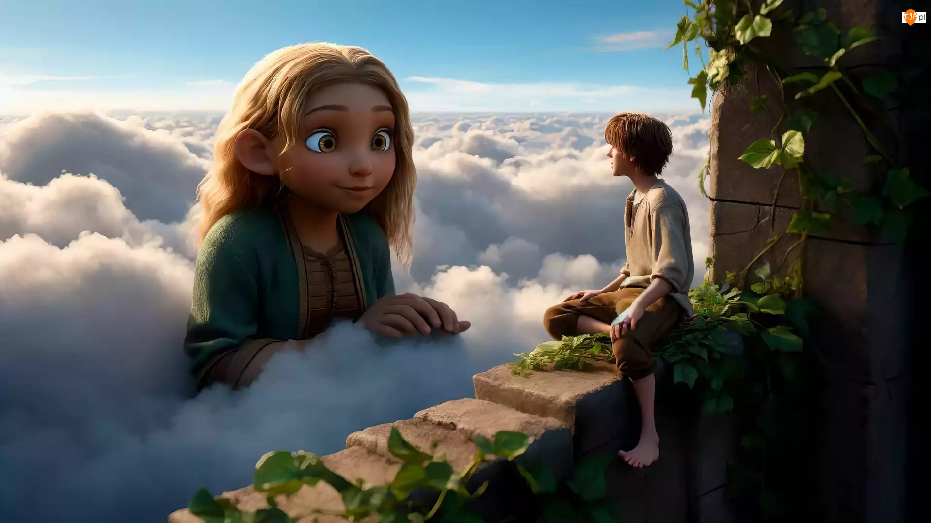 Dziewczyna, Gigantyczna, Zamek, Grafika, Chłopak, Chmury