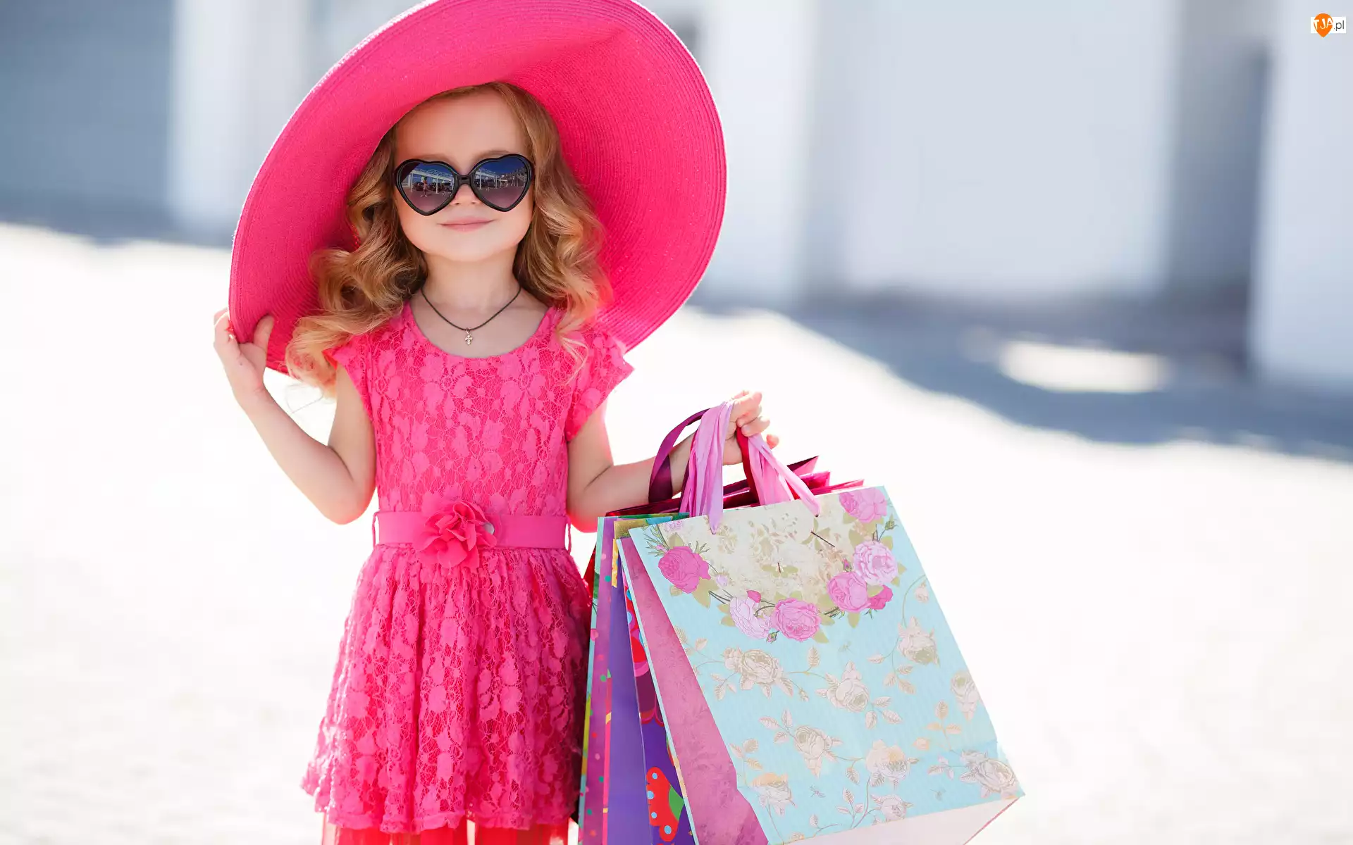 Różowy, Dziewczynka, Sukienka, Torby, Kapelusz, Okulary