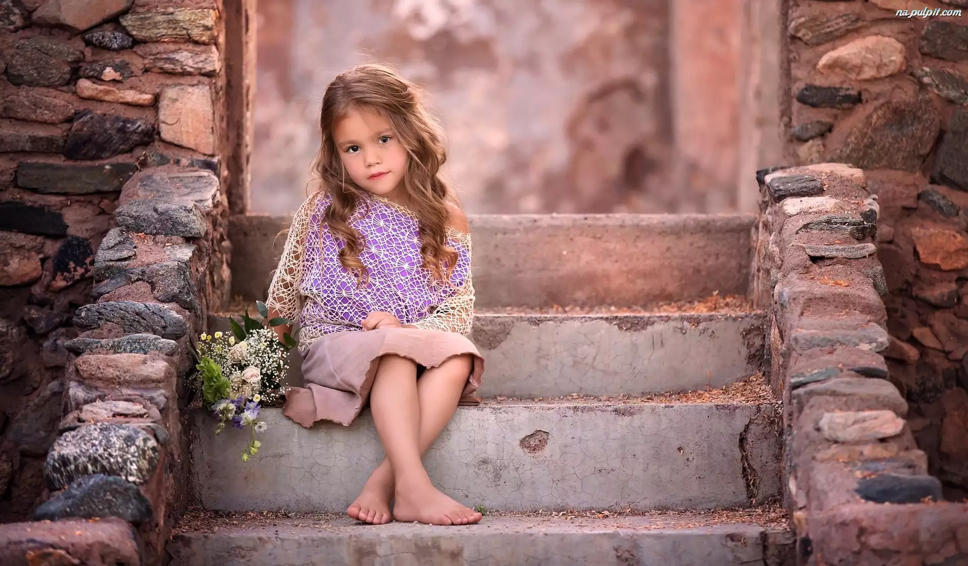 Dziewczynka z bukietem kwiatów siedzi na betonowy