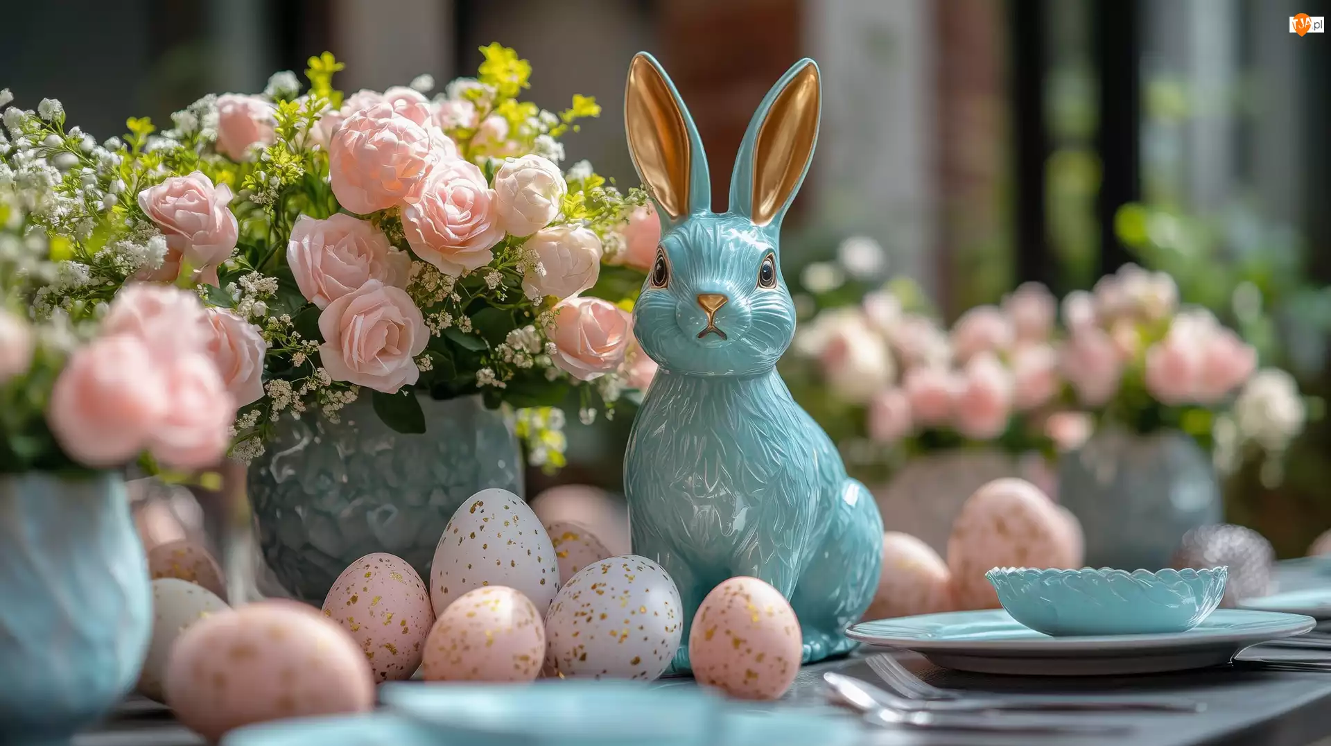 Figurka, Królik, Grafika, Wielkanoc, Róże, Kwiaty, Pisanki
