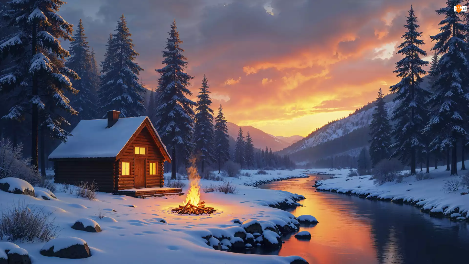 Góry, Dom, Zachód słońca, Drzewa, Niebo, Ognisko, Śnieg, Zima, Rzeka