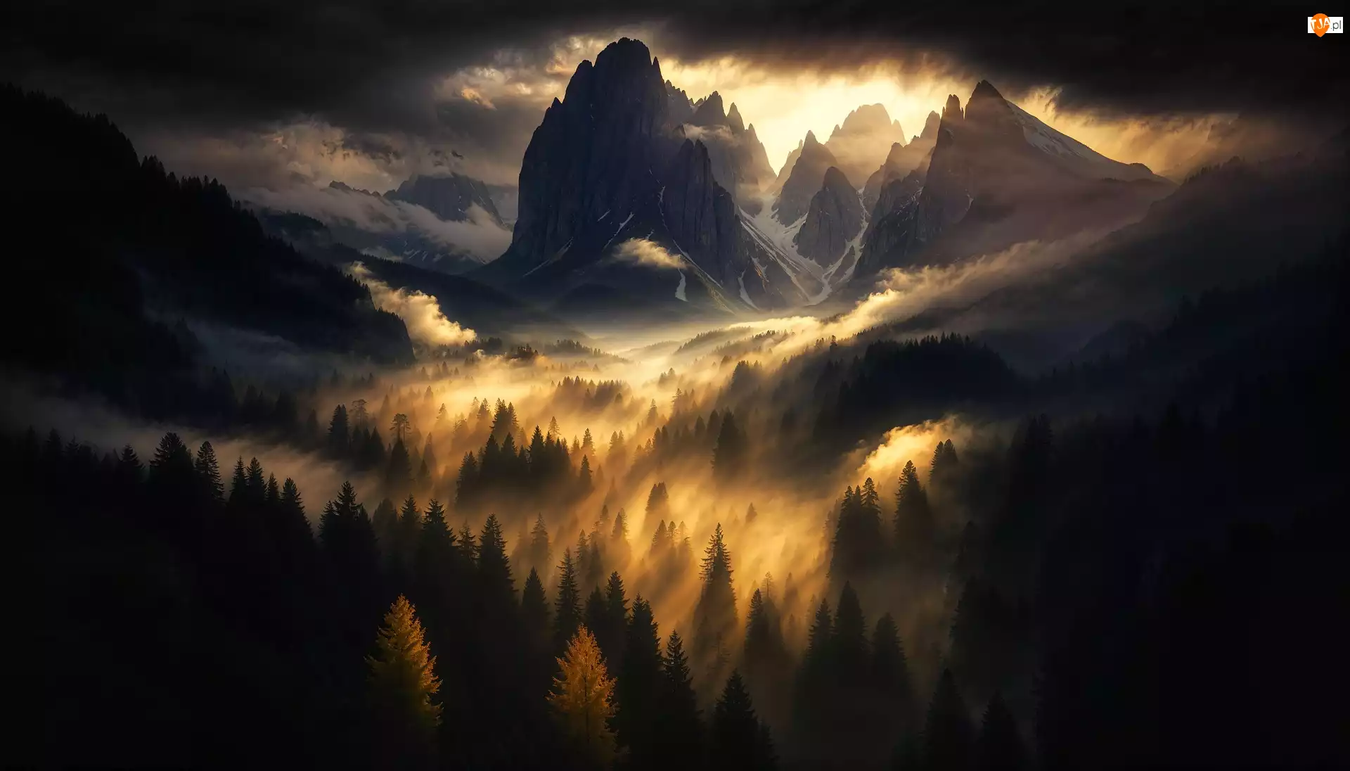 Drzewa, Zachód słońca, Szczyty, Góry, Mgła