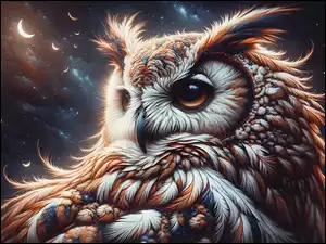 Sowa w księżycową noc z fruwającymi piórkami w grafice