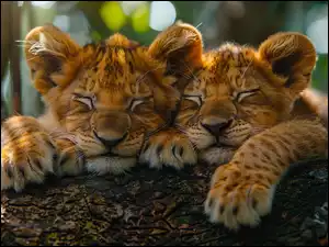 Dwa śpiące lwiątkaopartełapami i głowamio konar drzewa
