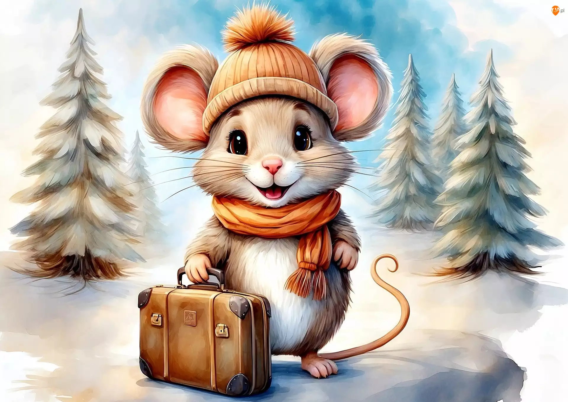 Grafika, Myszka, Drzewa, Śmieszne, Walizka, Szalik, Czapka