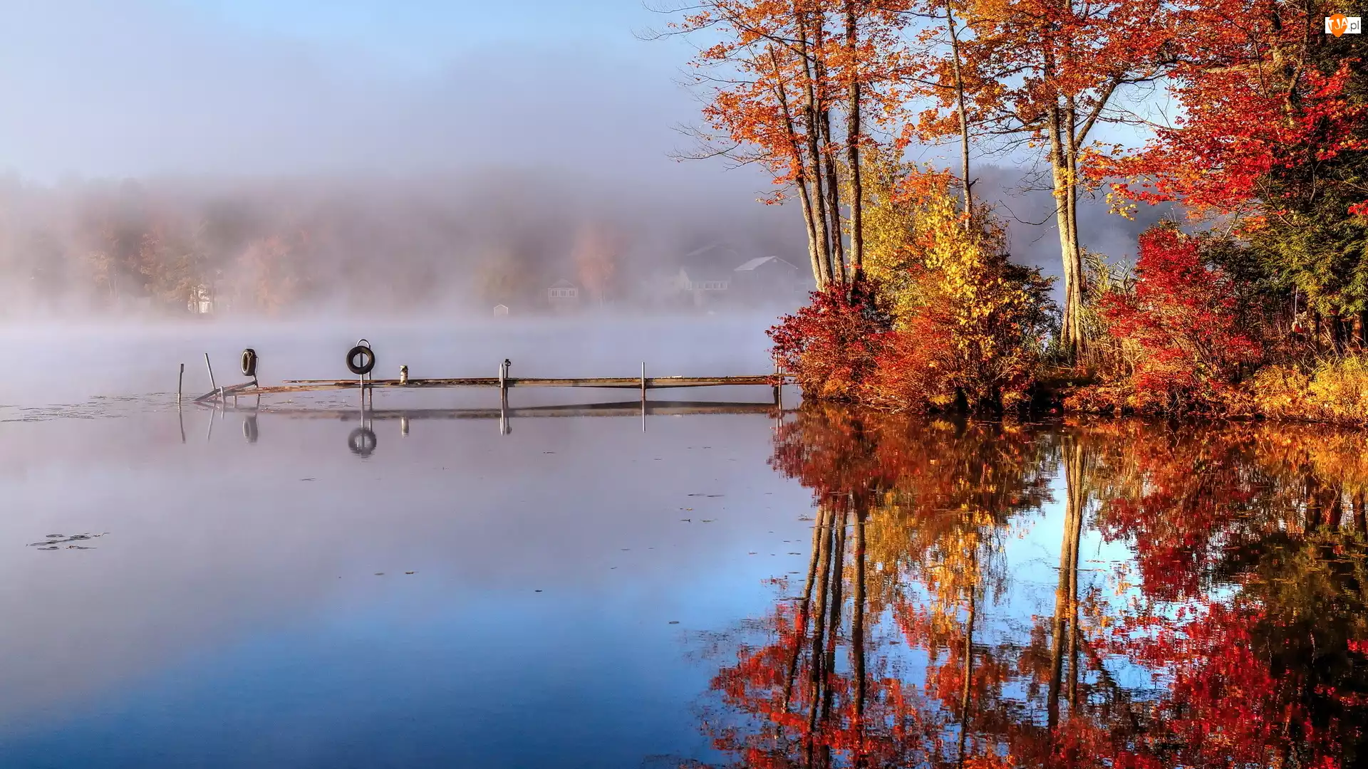 Drzewa, Jesień, Pomost, Jezioro, Mgła