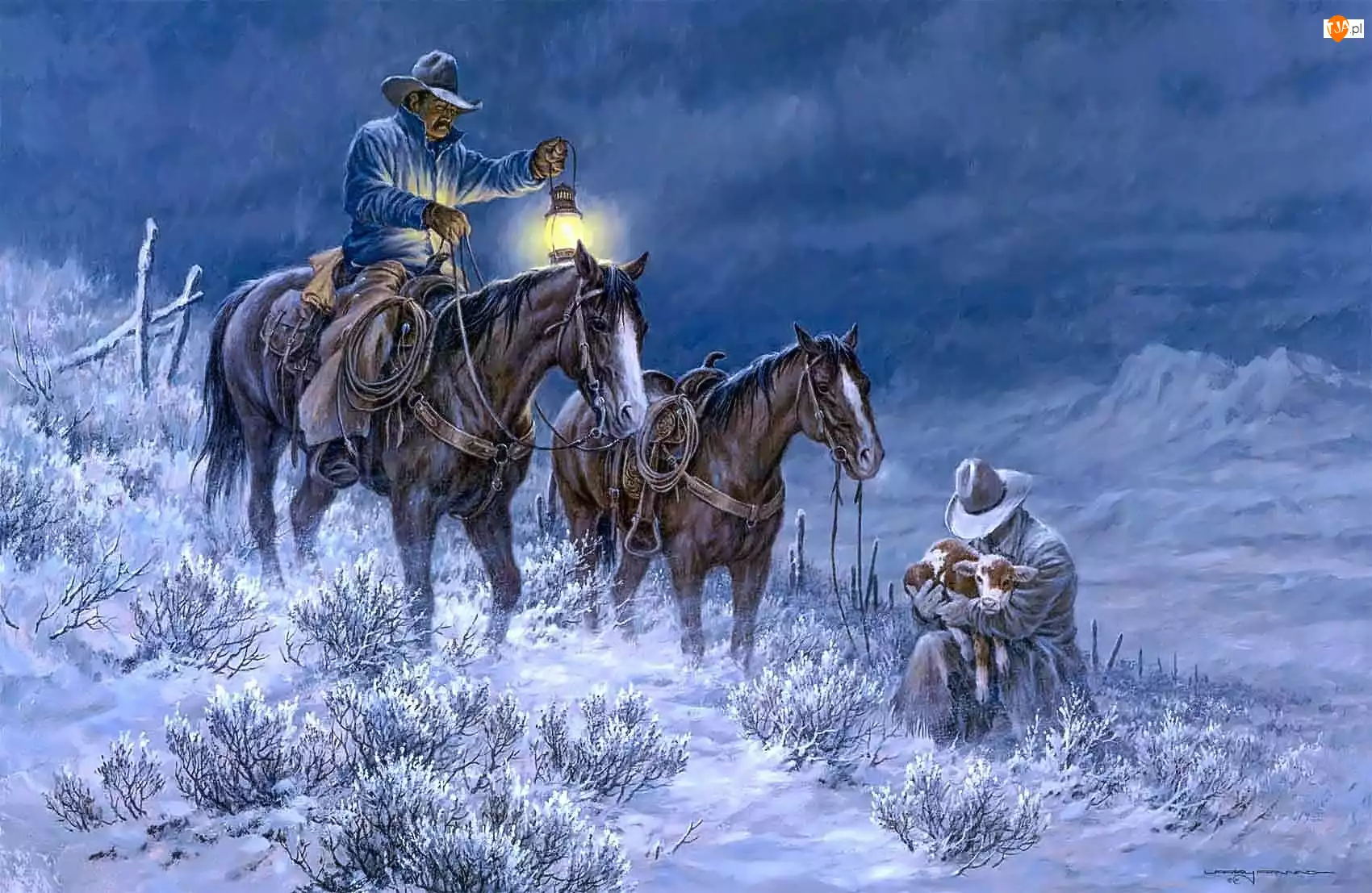 Jeźdźcy, Konie, Obraz, Zima, Larry Fanning, Kowb