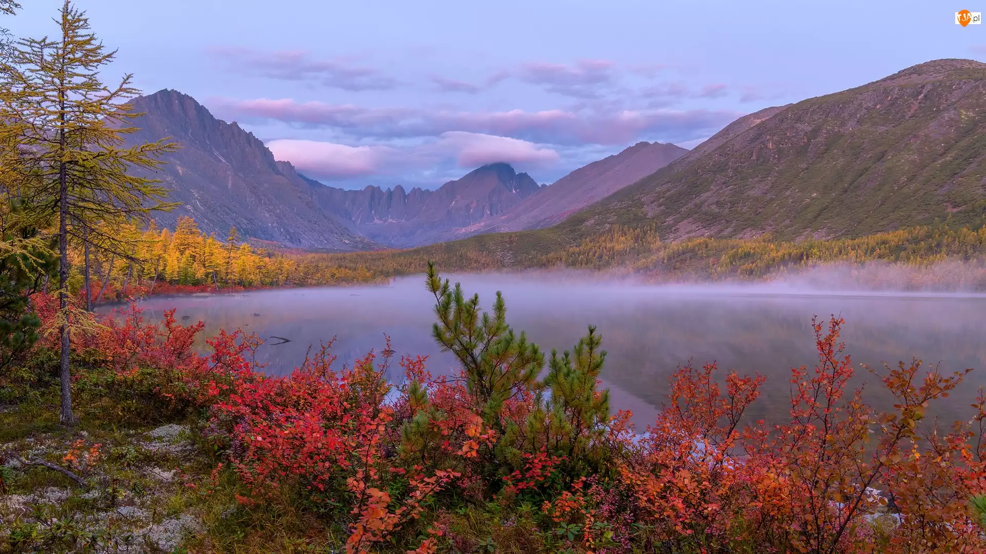 Kołyma, Góry, Drzewa, Obwód magadański, Masyw Angachak, Jesień, Rosja, Jezioro Nevidimka