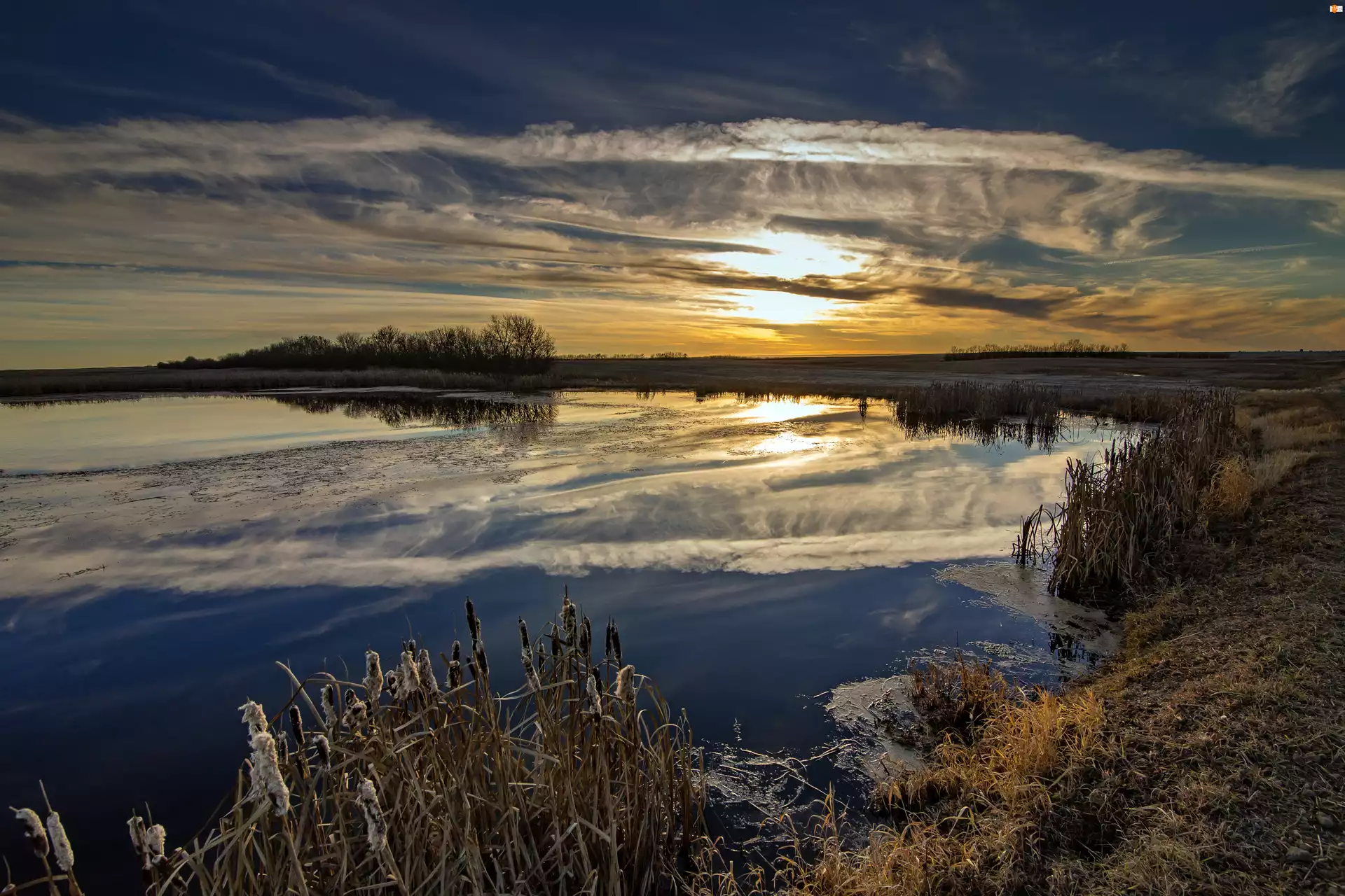 Trawy, Jezioro, Zachód słońca