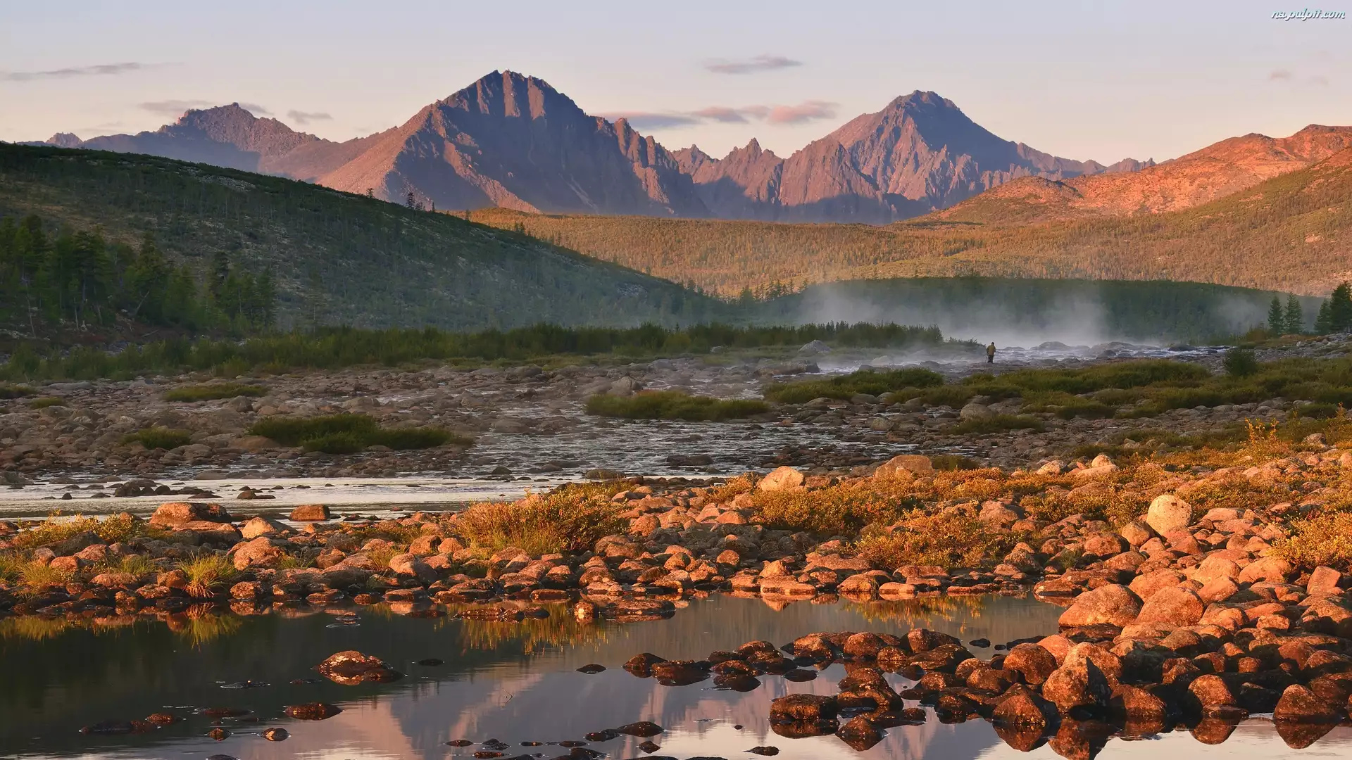 Kołyma, Brzeg, Góry Kołymskie, Obwód magadański, Jezioro Jack London, Las, Rosja, Kamienie