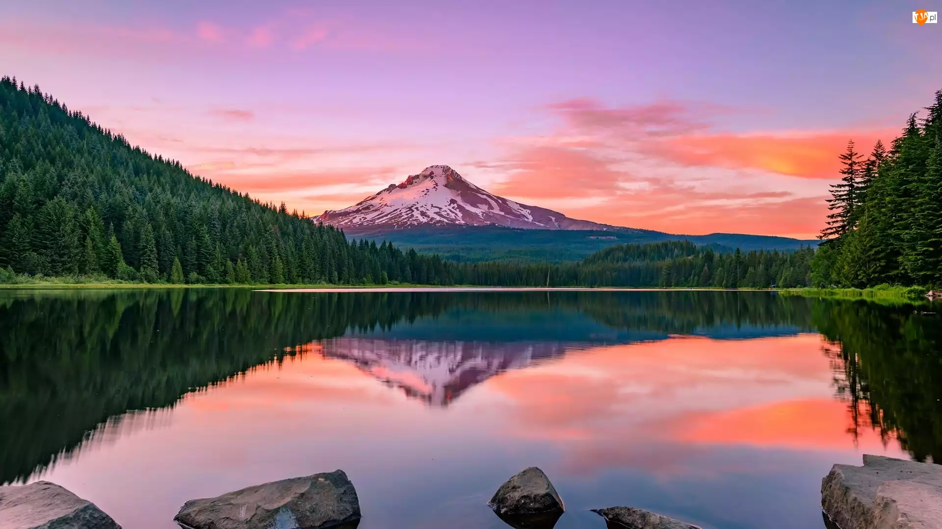 Stany Zjednoczone, Stratowulkan Mount Hood, Stan Oregon, Las, Chmury, Jezioro Trillium Lake, Kamienie, Góry, Drzewa