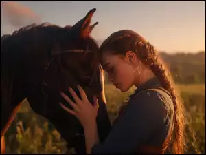 Dziewczyna z warkoczem oparta głową o łeb konia na łące