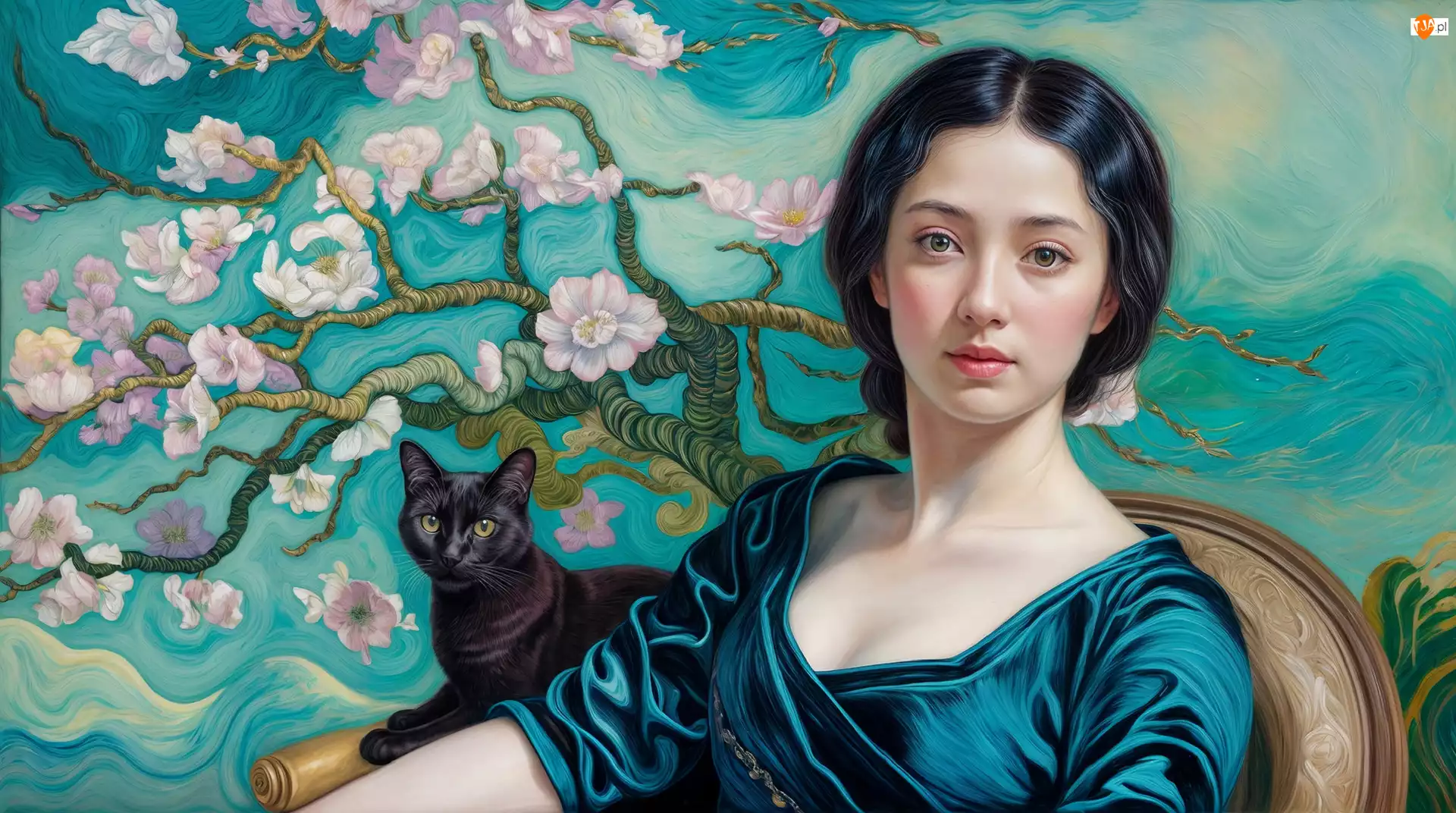 Kot, Kobieta, Kwiaty, Grafika AI, Fotel, Gałązki