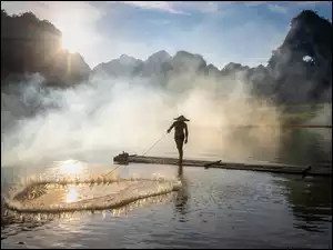 Witnamski rybak łowiący siecią z tratwywe mgle