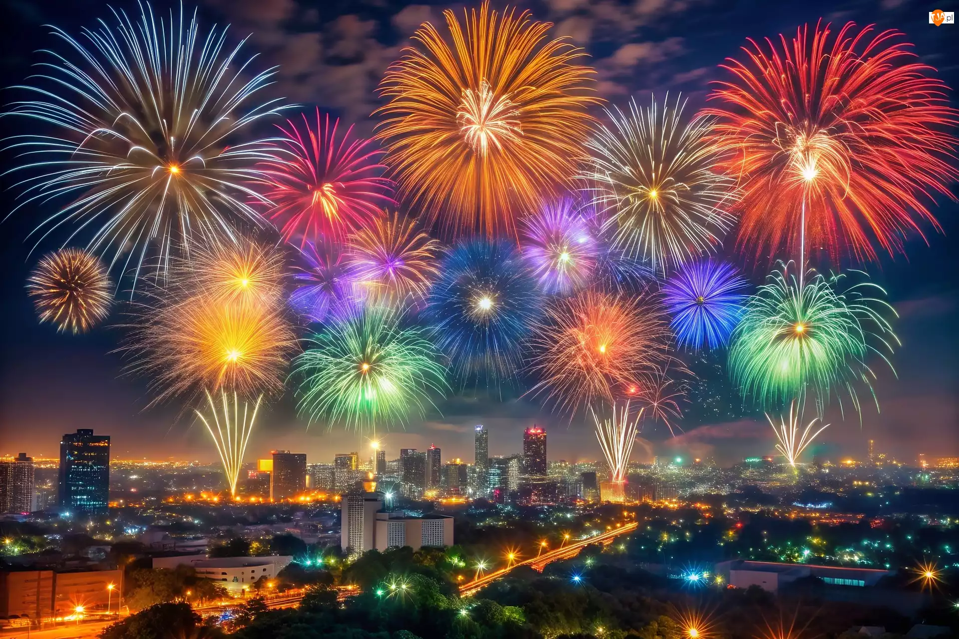 Fajerwerki, Noc, Światła, Sylwester, Miasto, Domy