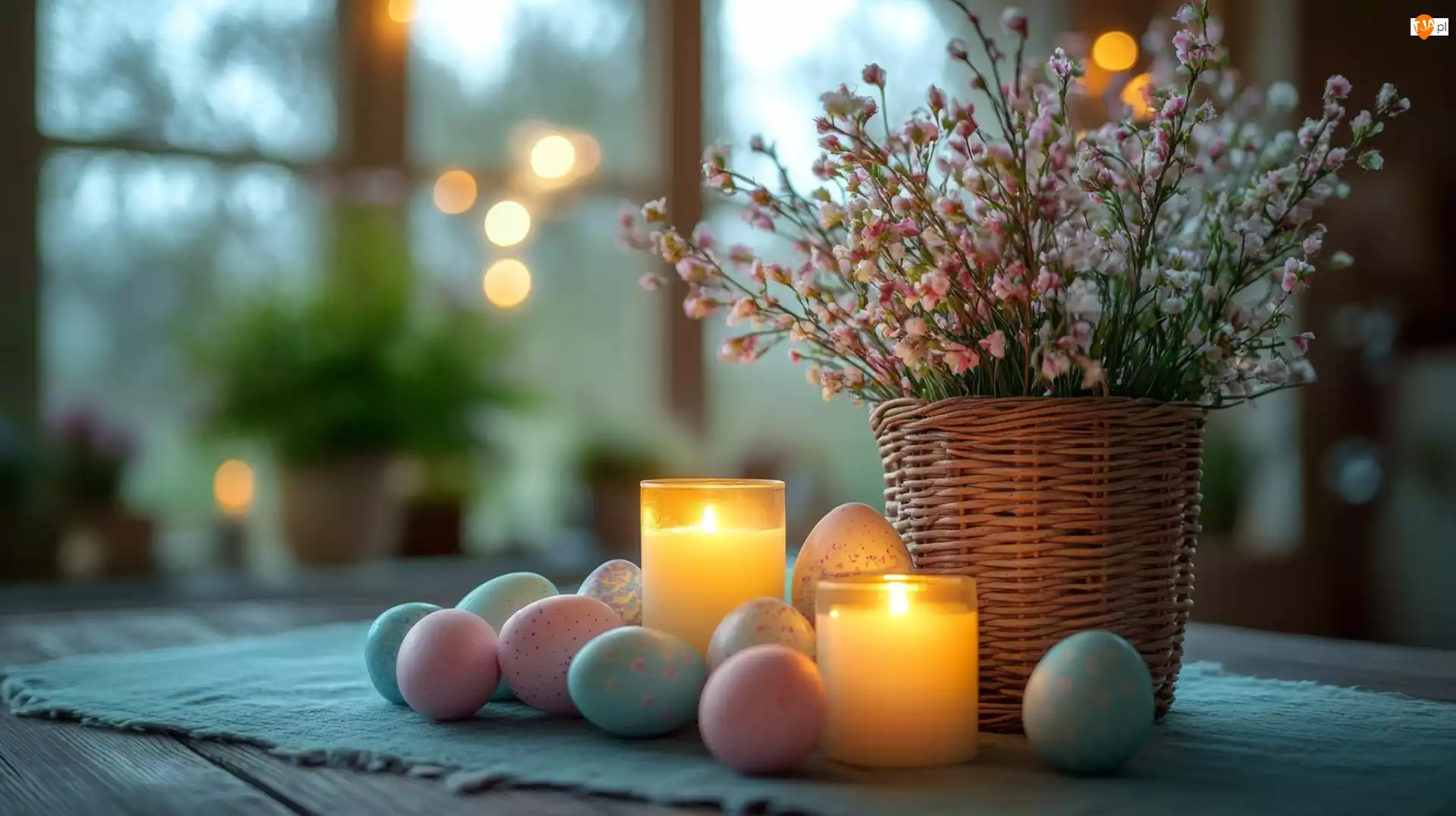 Kolorowe pisanki i zapalone świece obok kosza z k