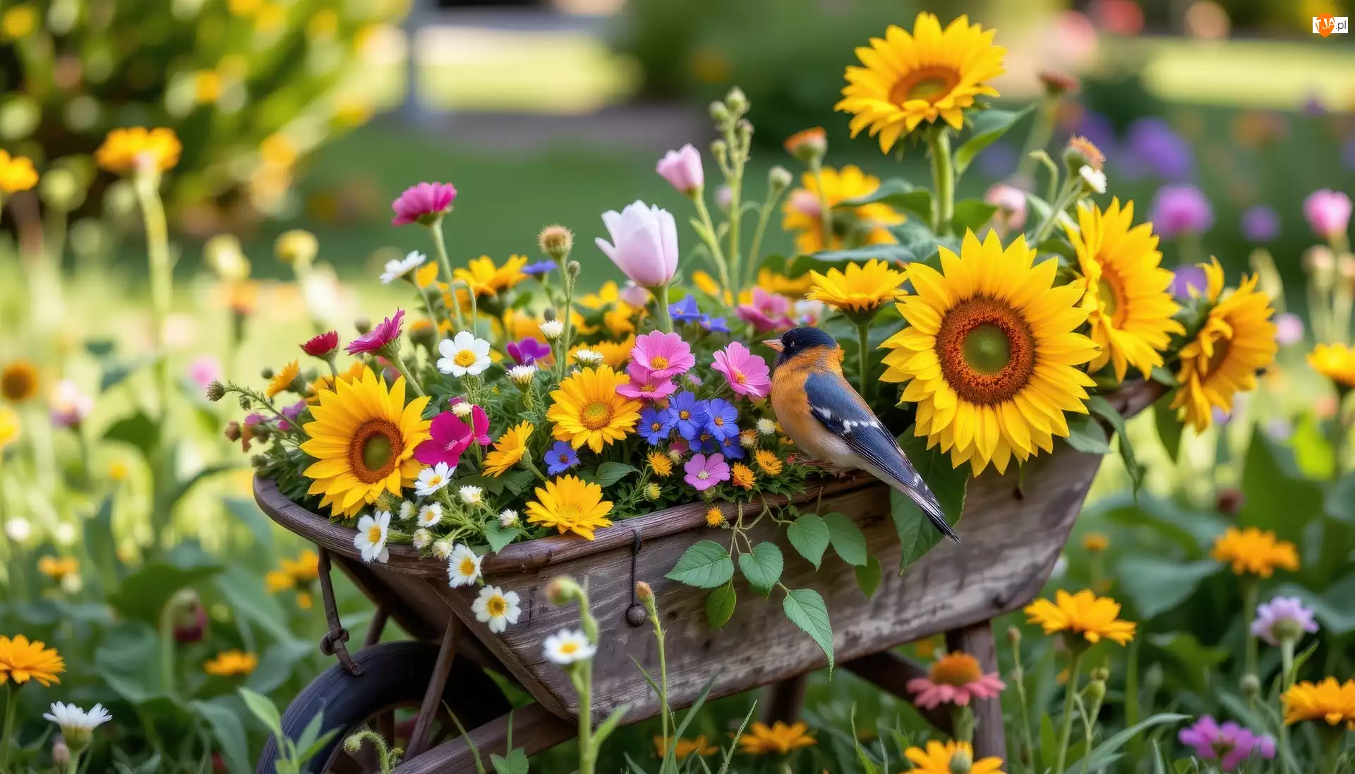 Słoneczniki, Taczka, Kwiaty, Ptak