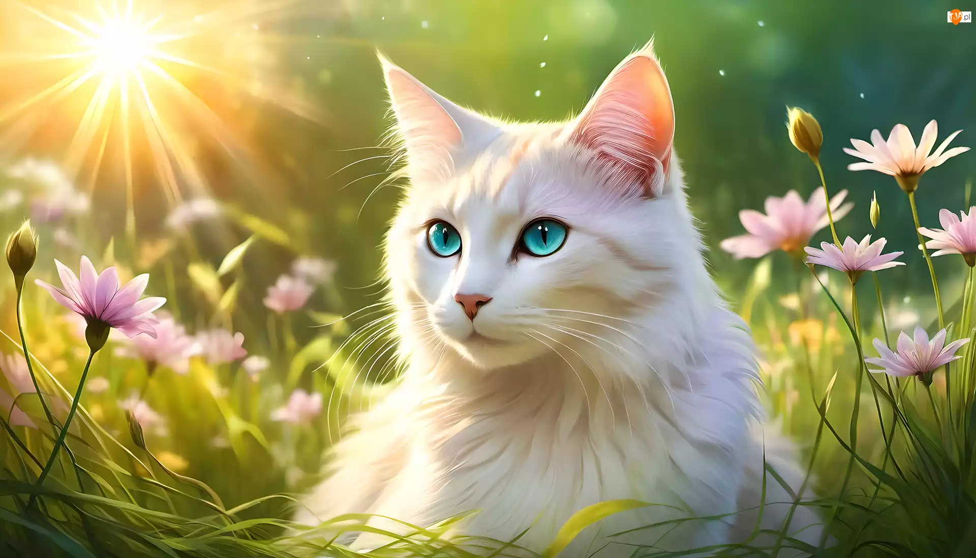 Kot, Biały, Oczy, Grafika, Zielone, Kwiaty