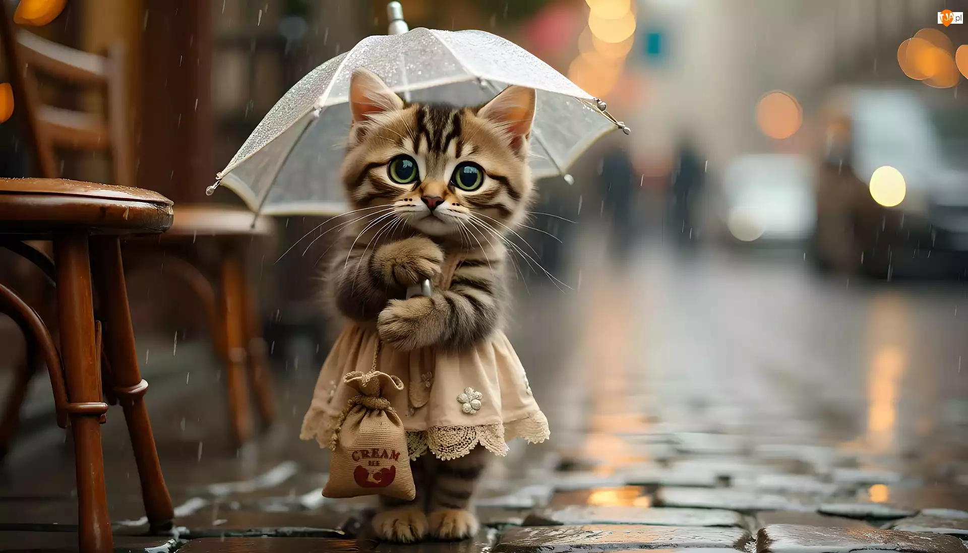Kotek w spódnicy stojący na ulicy w deszczu pod