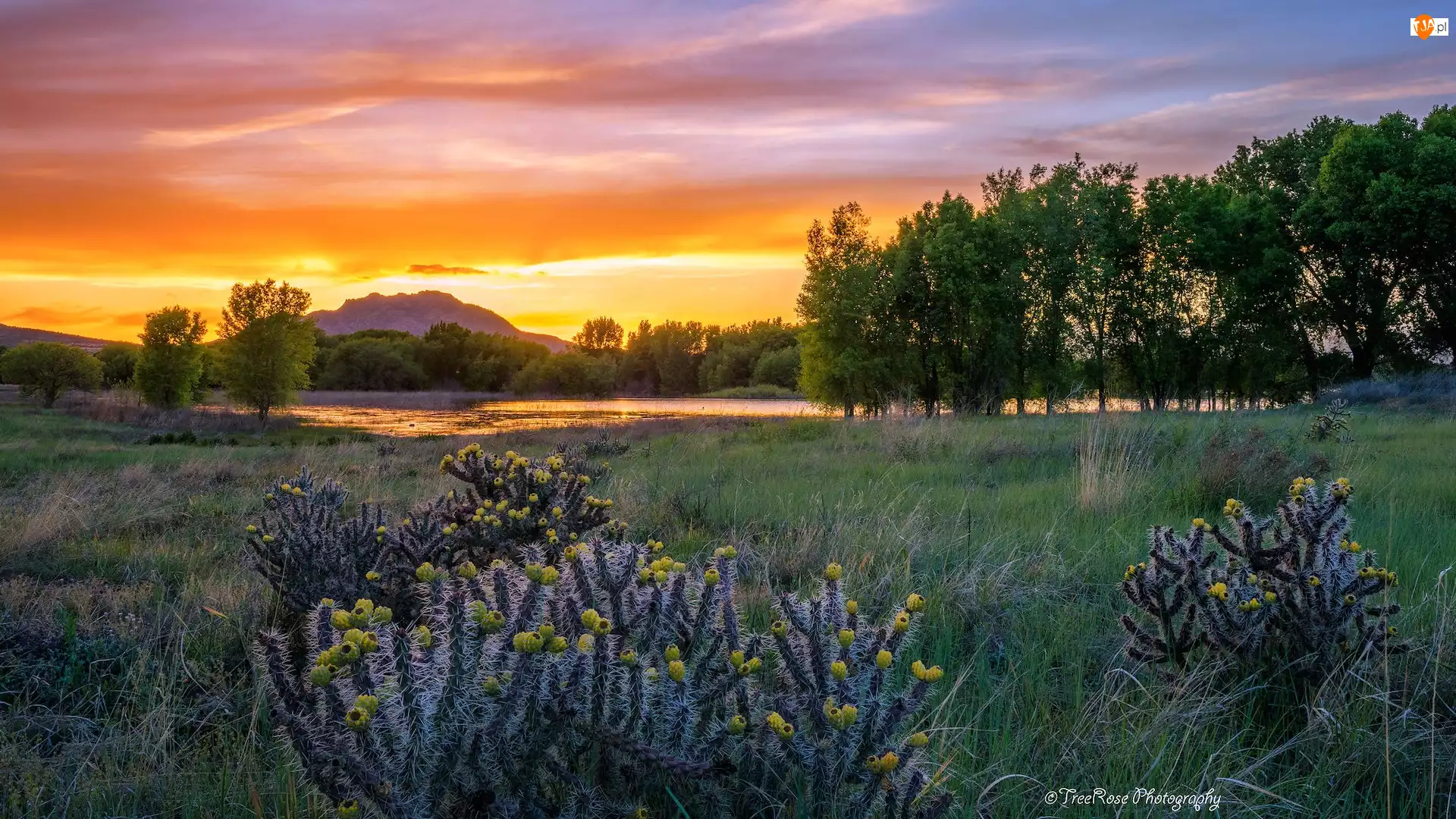 Prescott, Góra, Trawa, Arizona, Drzewa, Zachód słońca, Stany Zjednoczone, Rośliny