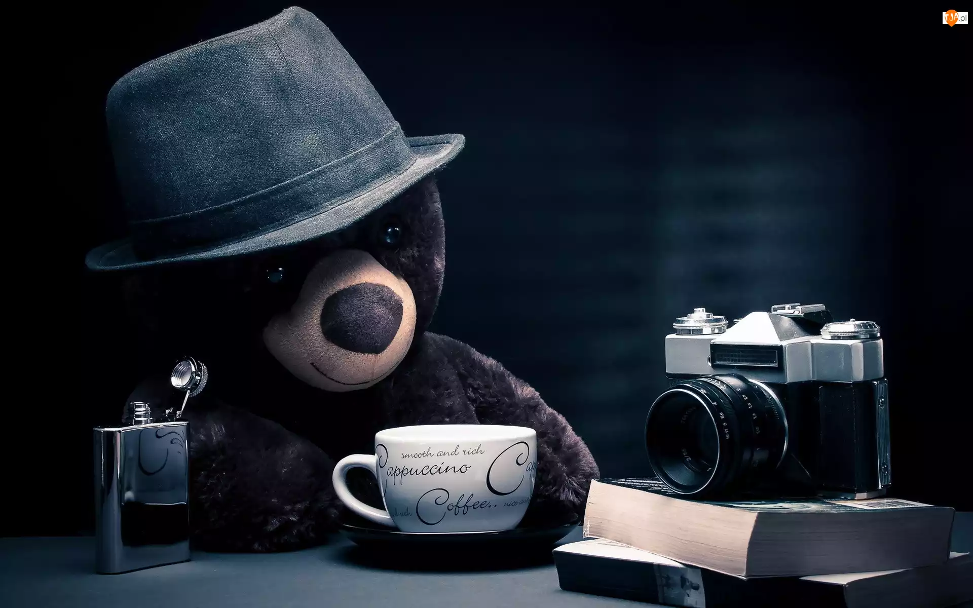 Książki, Filiżanka, Miś, Pluszowy, Aparat, Kapelusz, Piersiówka